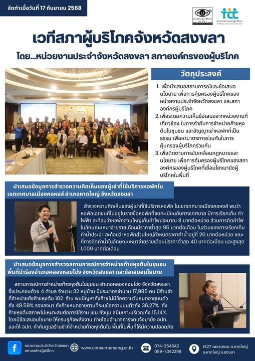 วันพุธ ที่ 17 กันยายน พ.ศ. 2568 หน่วยงานประจำจังหวัดสงขลา สภาองค์กรของผู้บริโภค จัดเวทีสภาผู้บริโภคจังหวัดสงขลา